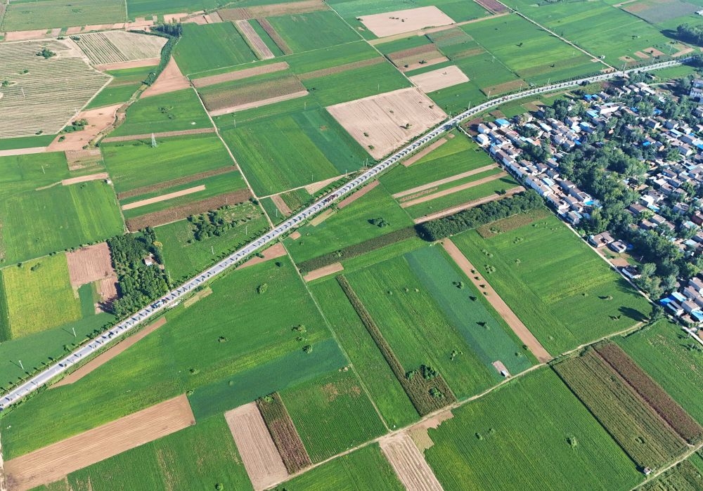 ↑2025年9月20日,在河南省南陽市臥龍區陸營鎮陸營村,陸續成熟的農作物與村莊相映成景。(無人機照片)CICPHOTO/高嵩 攝