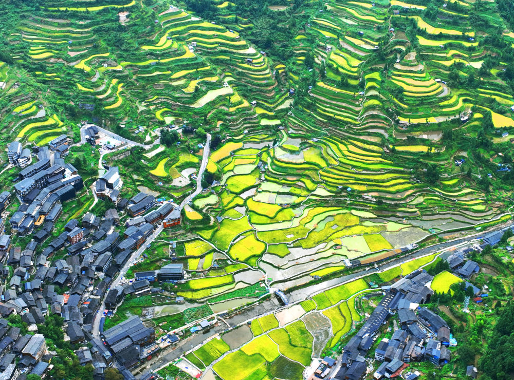 ↑2025年9月13日,在貴州省黔東南州雷山縣西江千戶苗寨,金燦燦的梯田與錯落有致的苗寨村莊交相輝映。(無人機照片)CICPHOTO/王建中 攝