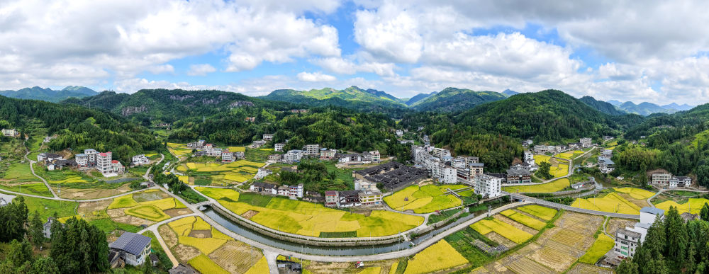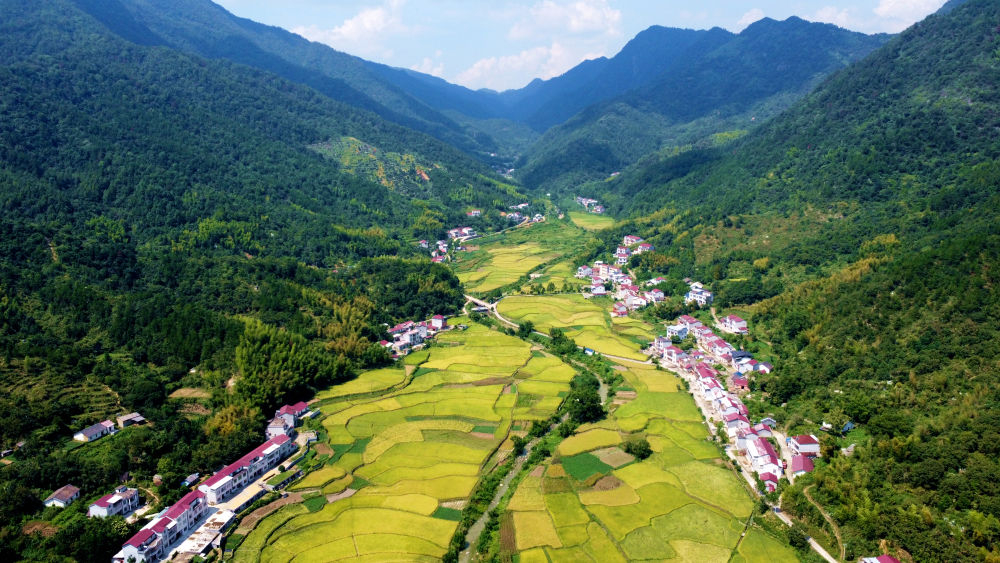 ↑2025年9月16日,在福建省福州市永泰縣同安鎮三捷村,金色稻田與遠山、民居相互映襯。(無人機照片)CICPHOTO/謝貴明 攝