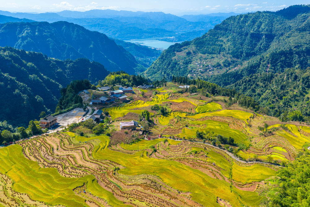 ↑2025年9月24日在云南省昭通市綏江縣中城鎮回望村拍攝的稻田。(無人機照片)CICPHOTO/曾三東 攝
