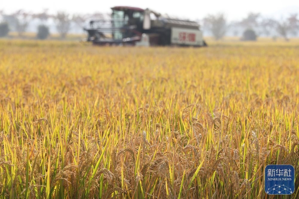 ↑ 11月2日,在浙江省湖州市德清縣乾元鎮(zhèn),農(nóng)機(jī)手駕駛收割機(jī)收獲晚稻。新華社發(fā)(倪立芳攝)
