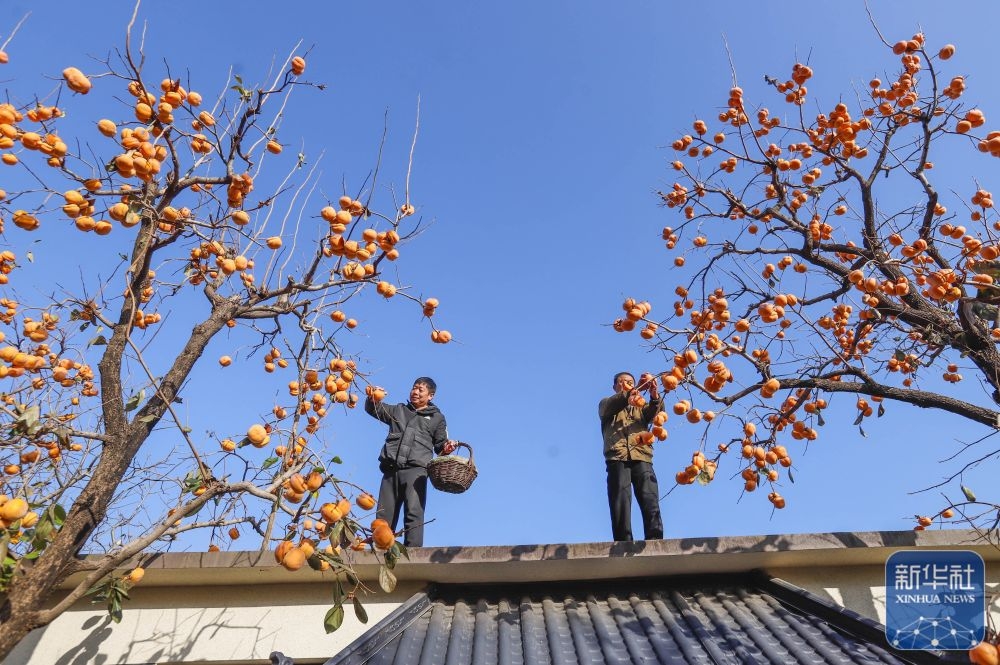 ↑ 11月1日,河北省遵化市娘娘莊鎮(zhèn)蘆各寨西山村農(nóng)民在庭院采摘柿子。新華社發(fā)(劉滿倉攝)