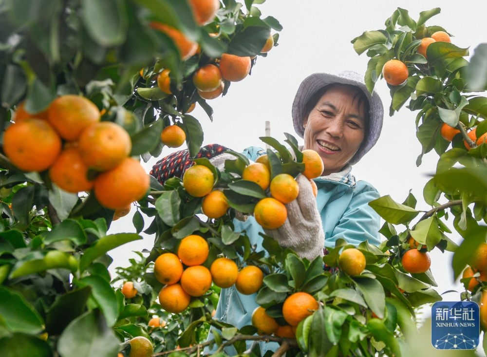 ↑ 11月2日,湖南省永州市道縣蚣壩鎮(zhèn)興橋村村民在采摘沙糖桔。新華社發(fā)(蔣克青攝)