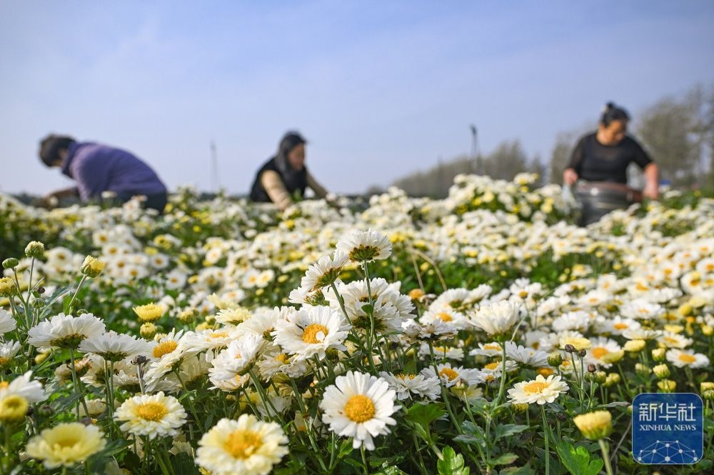 ↑ 10月29日,河南省商丘市夏邑縣王劉莊村村民在采摘菊花。新華社發(fā)(王高超攝)