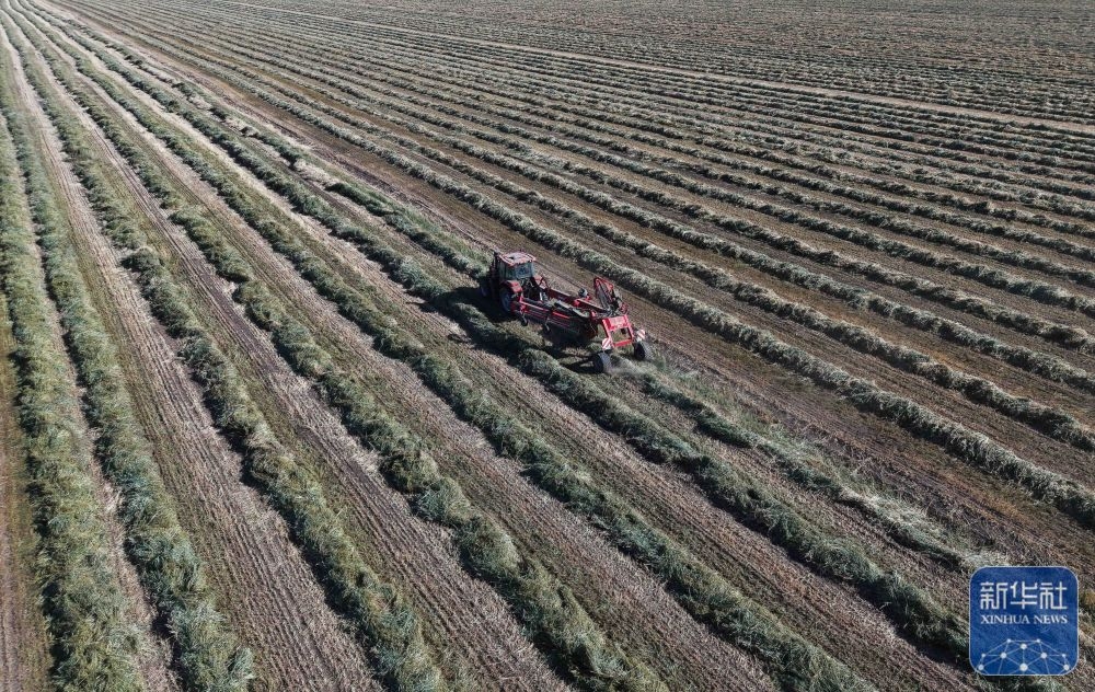 ↑ 11月1日,工人駕駛拖拉機(jī)在甘肅山丹馬場二場田間翻曬燕麥草(無人機(jī)照片)。新華社發(fā)(陳禮攝)