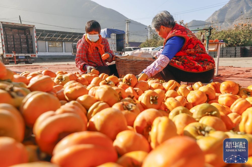 ↑ 11月1日,河北省遵化市娘娘莊鎮(zhèn)蘆各寨西山村農(nóng)民在場院挑選柿子。新華社發(fā)(劉滿倉攝)