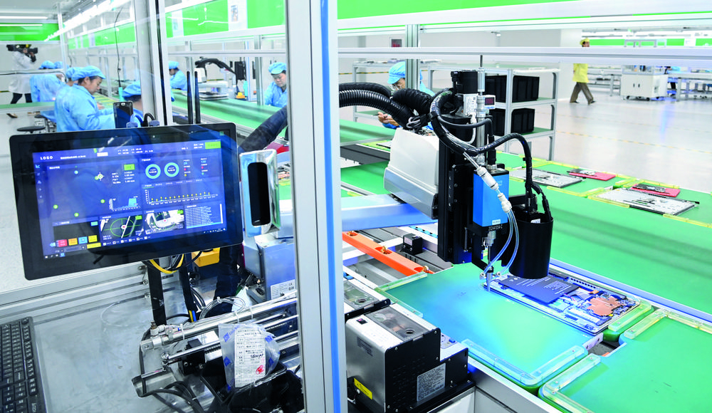 在格瑞邦(河北)數字科技有限公司數字化智能生產線,機器人正在進行筆記本電腦的生產。