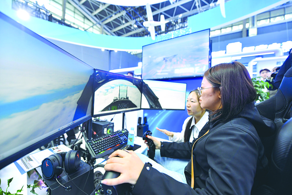 ▲觀眾在博覽會現場體驗模擬飛行設備。 新華社記者 王 曉 攝
