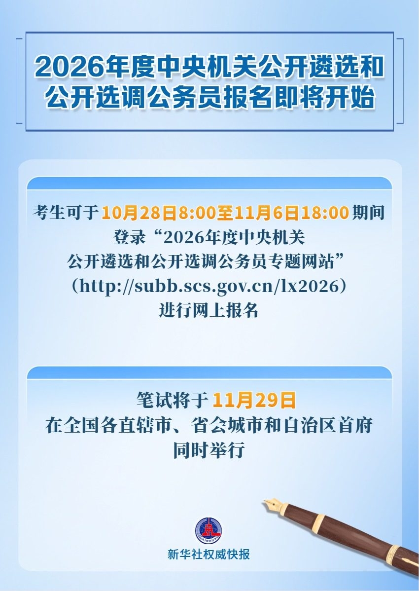 記者10月27日從國家公務員局獲悉,2026年度中央機關公開遴選和公開選調公務員報名即將開始,考生可于10月28日8:00至11月6日18:00期間,登錄“2026年度中央機關公開遴選和公開選調公務員專題網站”(http://subb.scs.gov.cn/lx2026)進行網上報名,筆試將于11月29日在全國各直轄市、省會城市和自治區首府同時舉行。據了解,本次公開遴選和公開選調中央機關共有35個部門參加,計劃選拔279人。