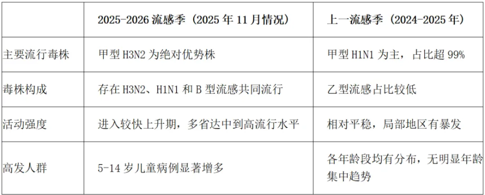 今年流感的核心變化是流行毒株變了!上一季主導的甲型H1N1退居次位,甲型H3N2成為本季主流毒株。由于H3N2近兩年沒有大規模流行,人群普遍缺乏針對性免疫屏障,感染風險明顯上升。要注意的是,即便H3N2亞型名稱沒變,病毒表面抗原也會持續發生微小變異,每一季流行的毒株都和前一年略有不同,對免疫系統來說堪稱“似曾相識的新敵人”。