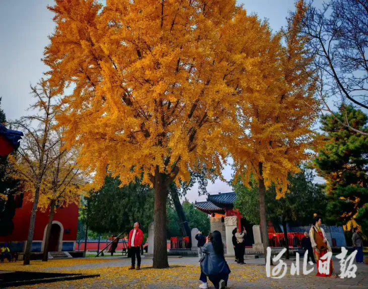 11月8日,在毗盧寺內,古銀杏樹更具韻味,金黃葉片襯著古建飛檐,不少攝影愛好者架起相機記錄這份古樸之美。