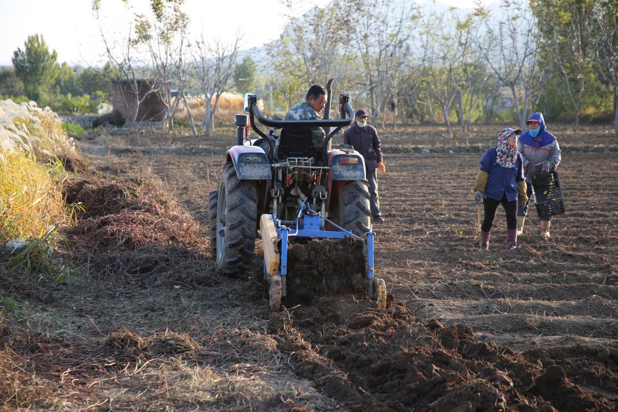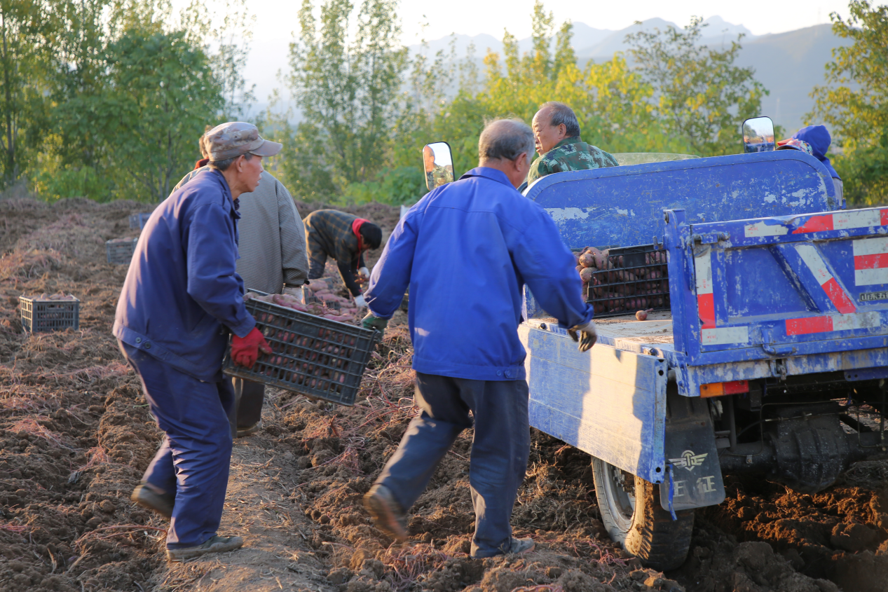 機(jī)械化作業(yè)更讓收獲效率大幅提升,挖掘、分揀、裝運環(huán)環(huán)相扣,村民們戴著手套,拾掇紅薯、輕拂泥塵、裝入筐中,不一會兒便堆起“紅薯山”。