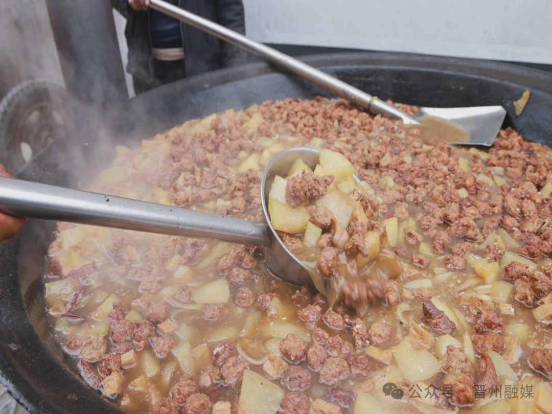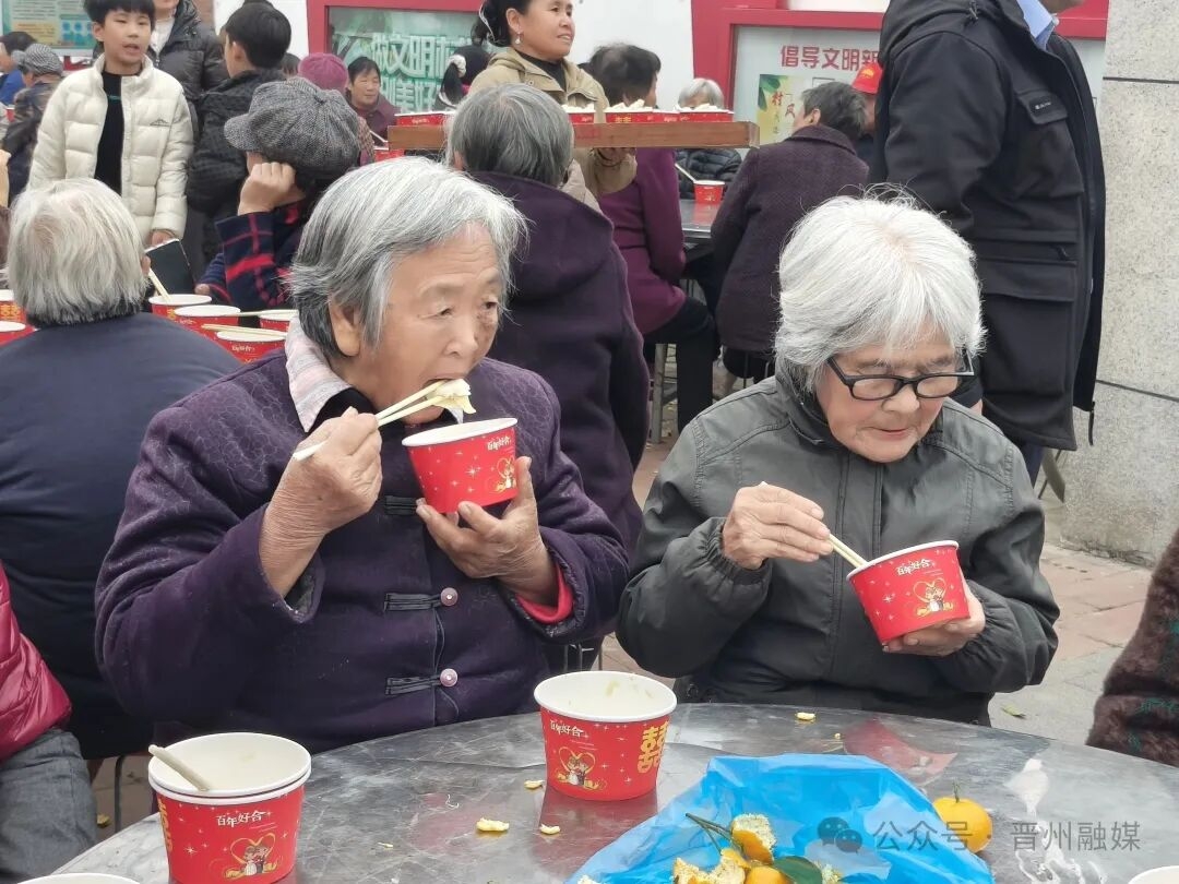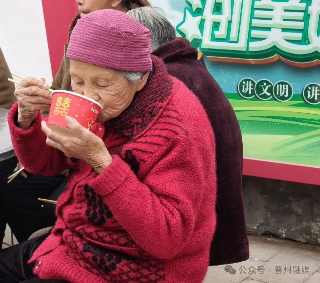 另一邊,大鍋里燉得大鍋菜咕嘟作響,濃郁的香氣伴著熱氣彌漫開來。志愿者們提前擺好桌椅,將熱騰騰的飯菜和饅頭送到老人手中,飯香與歡聲笑語交織,匯成最溫馨的節日圖景。