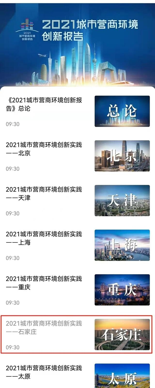 目前,《報告》全文已在央視財經客戶端《2021城市營商環境創新報告》專區正式上線。其中,《2021城市營商環境創新實踐——石家莊市》發布。