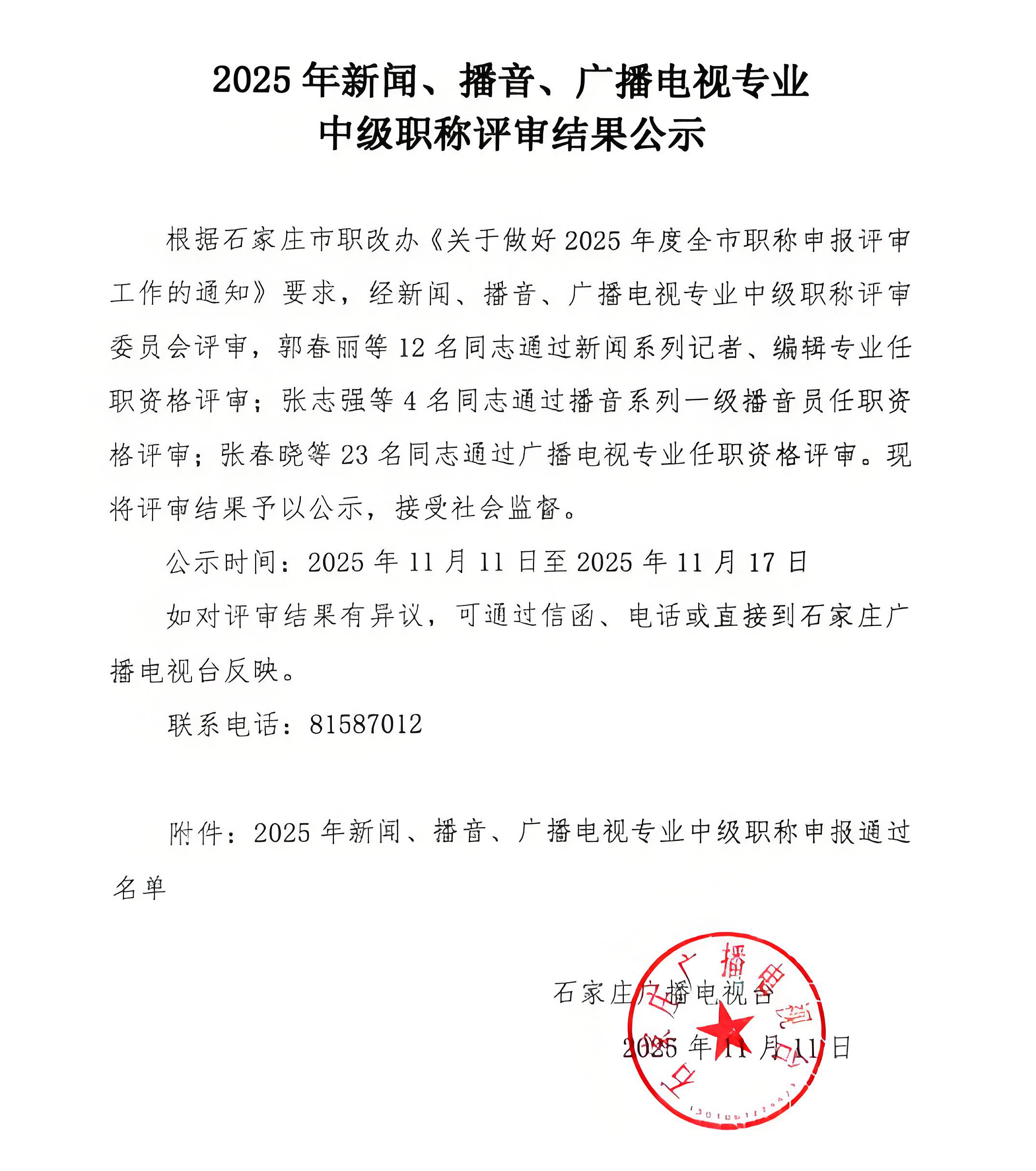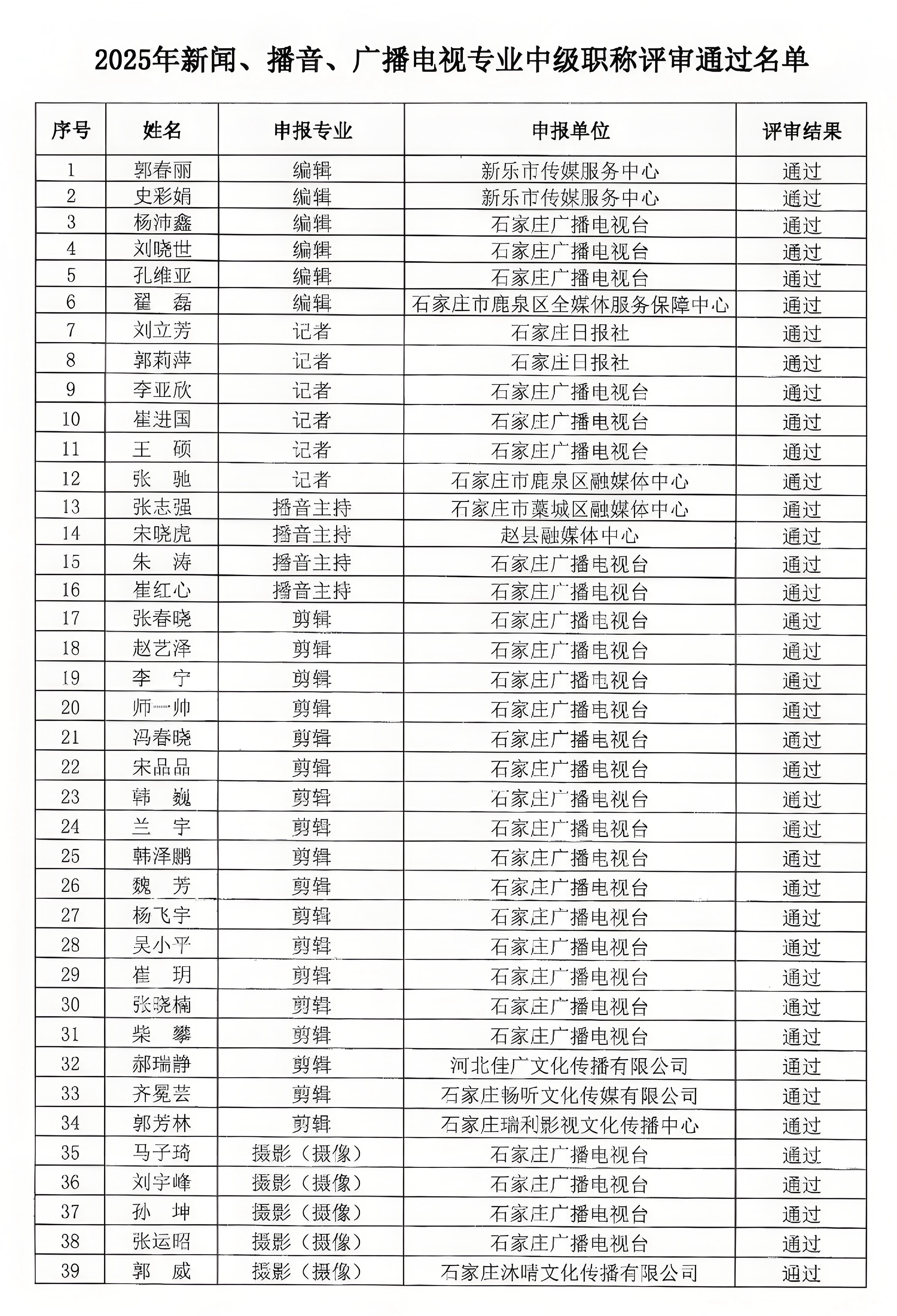 2025年新聞、播音、廣播電視專業(yè)中級(jí)職稱評(píng)審結(jié)果公示