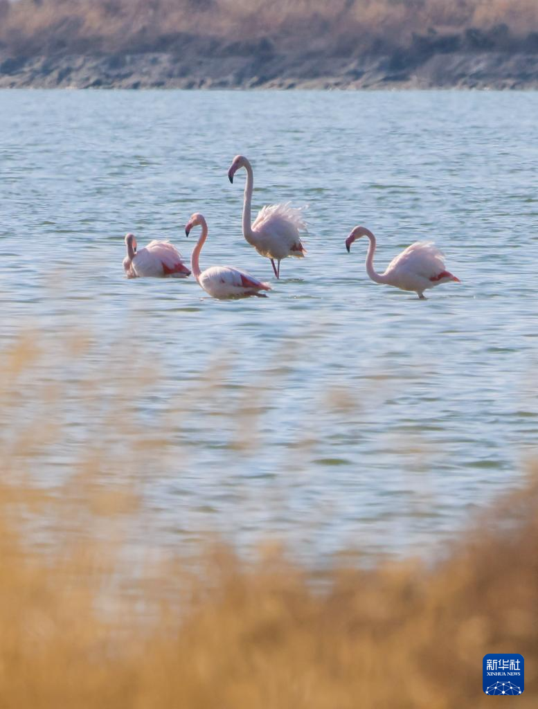 11月19日,火烈鳥在山西運(yùn)城鹽湖棲息。