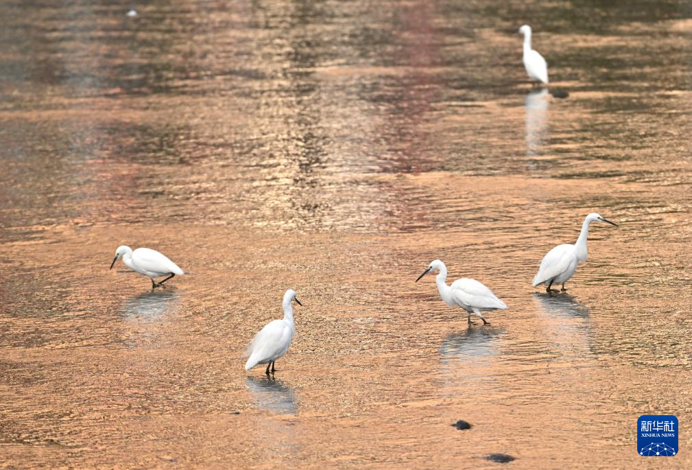 11月19日,白鷺在湖北省宣恩縣城貢水河覓食。