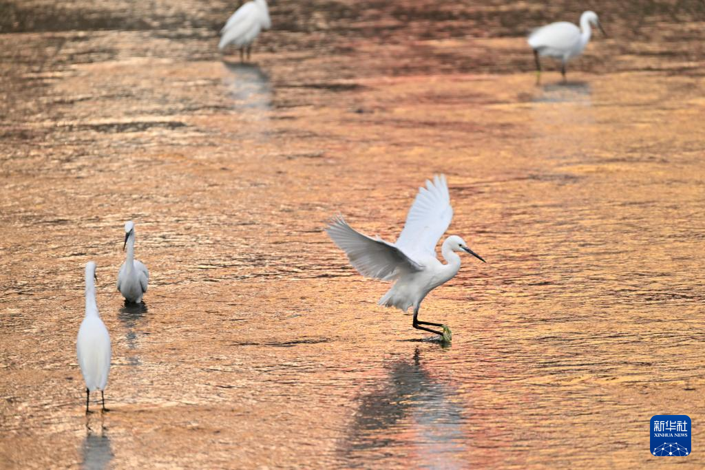 11月19日,白鷺在湖北省宣恩縣城貢水河飛舞嬉戲。