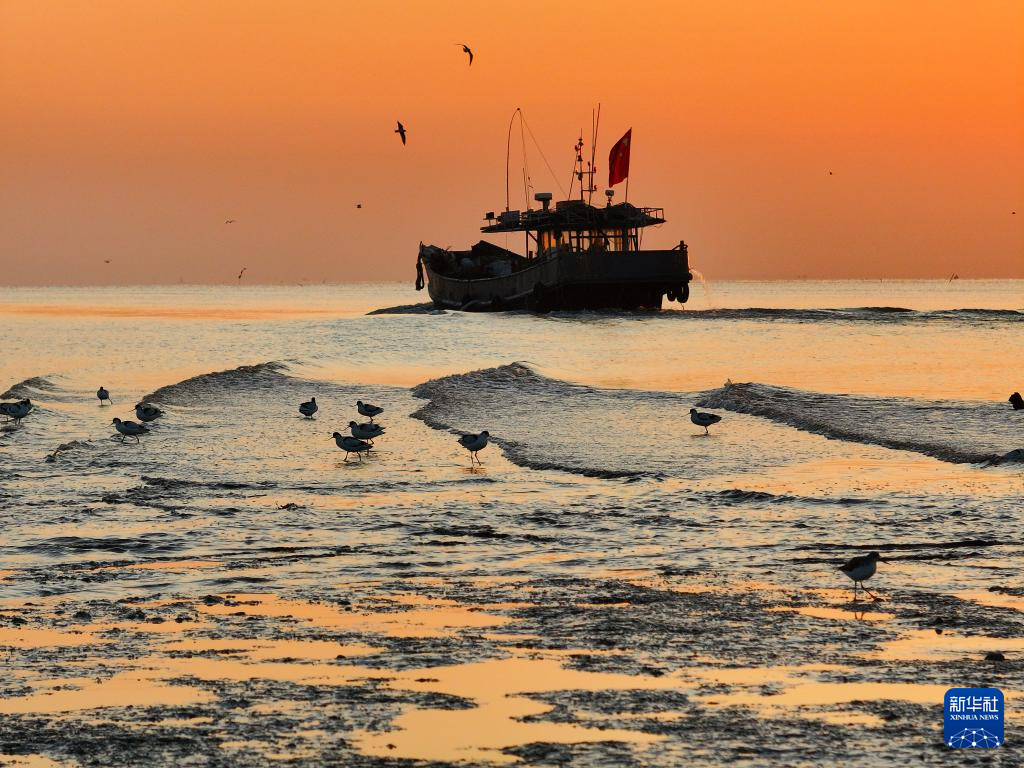 11月19日,海鳥在江蘇省連云港市贛榆區(qū)沿海濕地里覓食(無人機(jī)照片)。