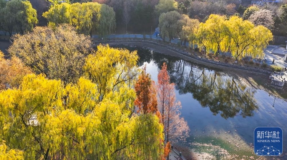 ↑ 11月21日,游人在河北省遵化市人民公園游覽(無人機照片)。新華社發(劉滿倉攝)