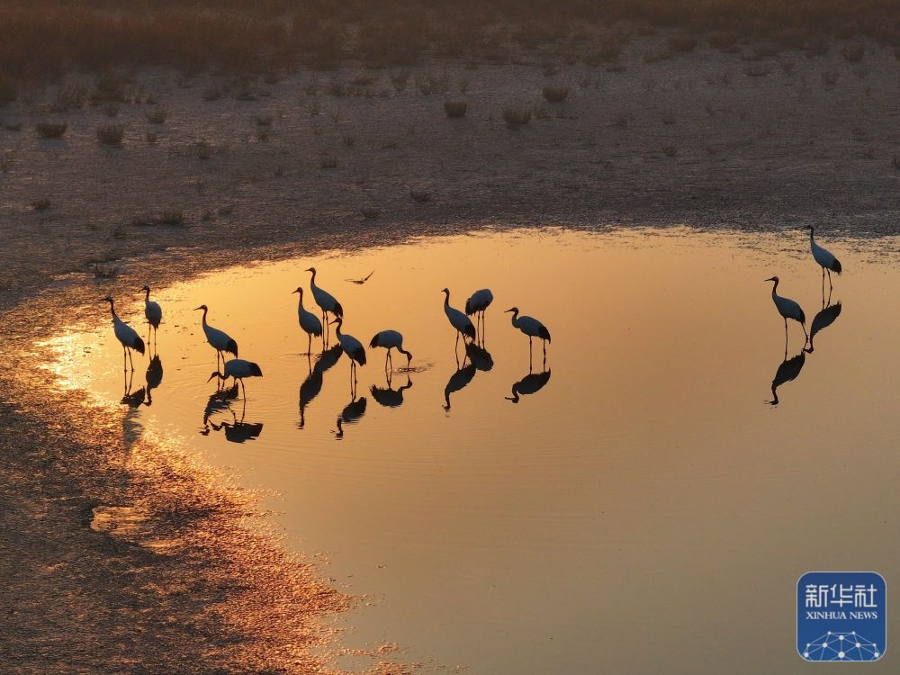 ↑ 11月21日,鶴群在江蘇省連云港市海州灣沿海濕地棲息(無人機照片)。新華社發(司偉攝)