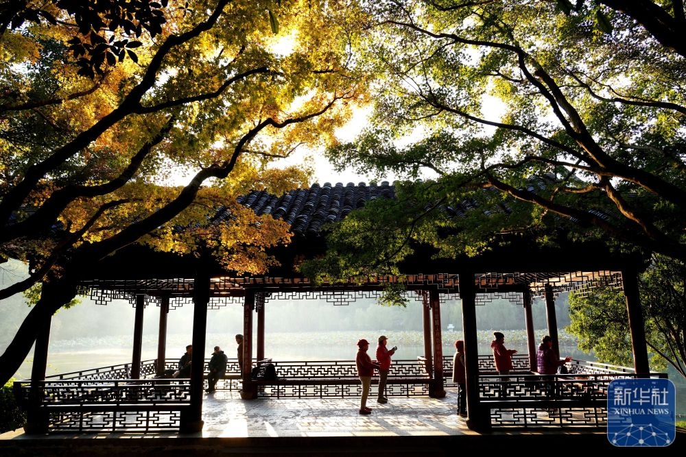 ↑ 11月21日,人們在杭州西湖綠水芙蕖亭中晨練。新華社發(莊穎昶攝)