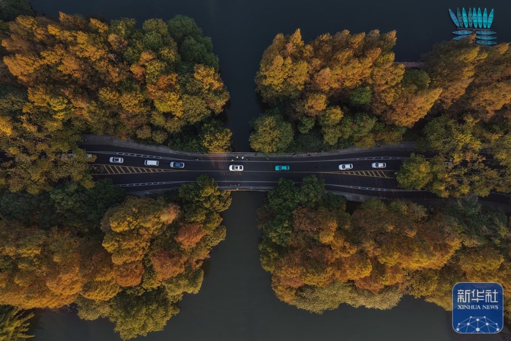 ↑ 11月21日,汽車行駛在杭州西湖景區的楊公堤上,游客乘船從橋下穿過(無人機照片)。新華社記者 黃宗治 攝