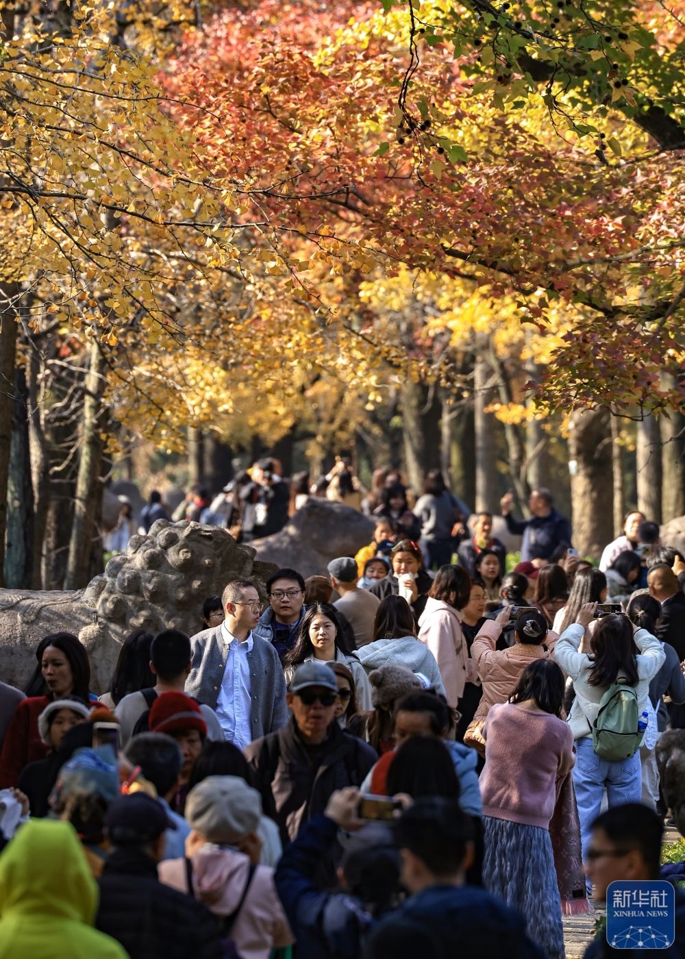 ↑ 11月21日,游人在南京明孝陵景區石象路游玩。新華社發(辛一攝)