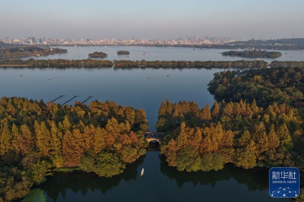↑ 11月21日拍攝的杭州西湖景區楊公堤附近的景色(無人機照片)。新華社記者 黃宗治 攝